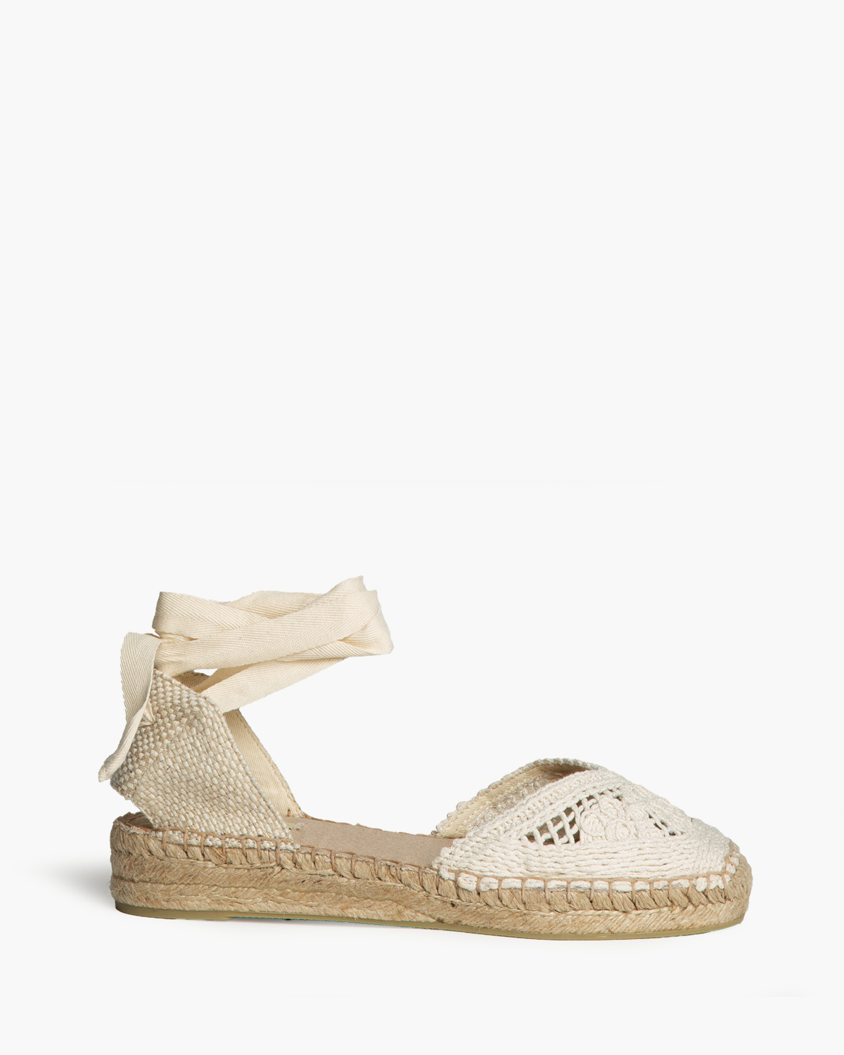 Sandalia plana tipo alpargata con suela de yute. Cierre mediante lazo anudado al tobillo.