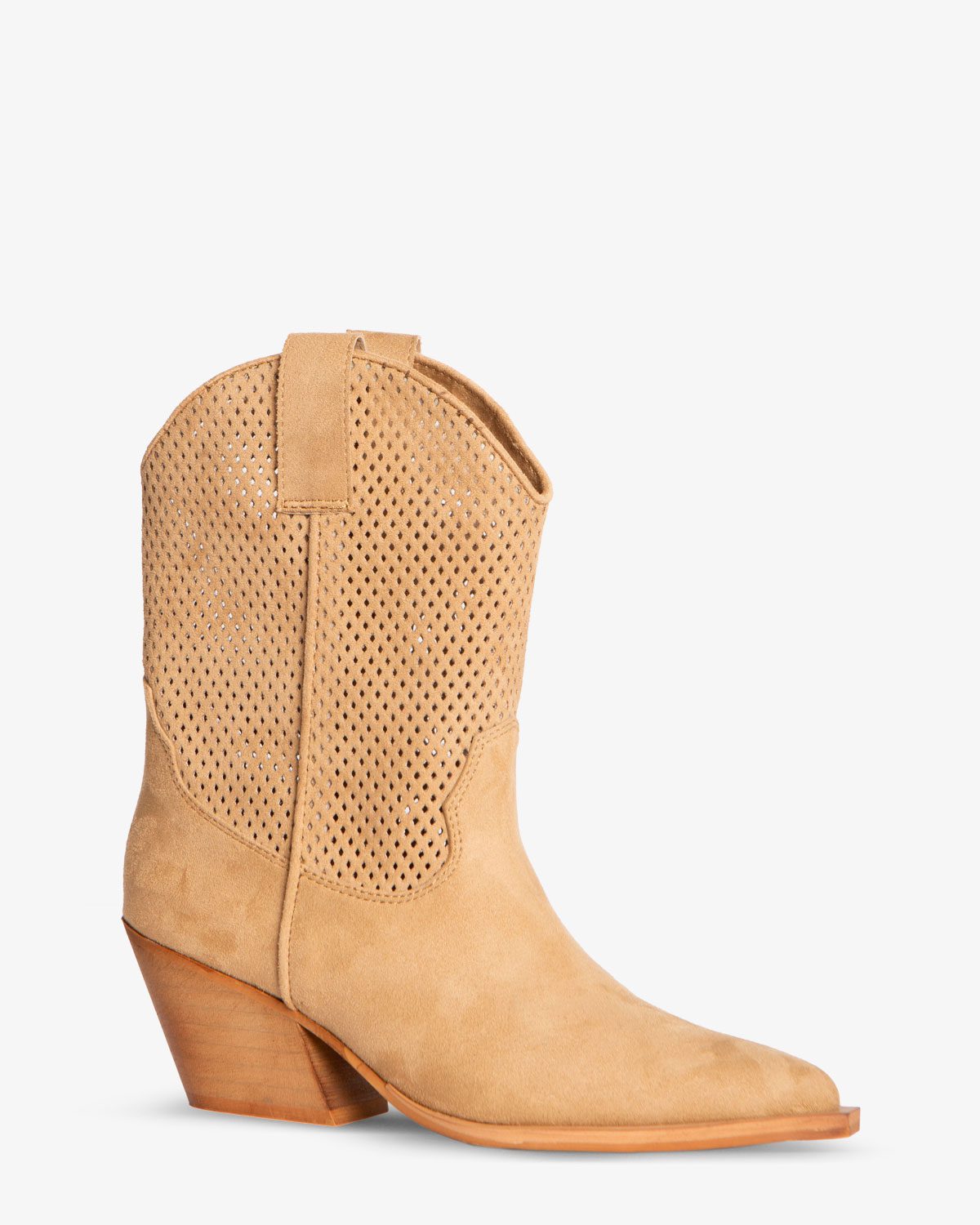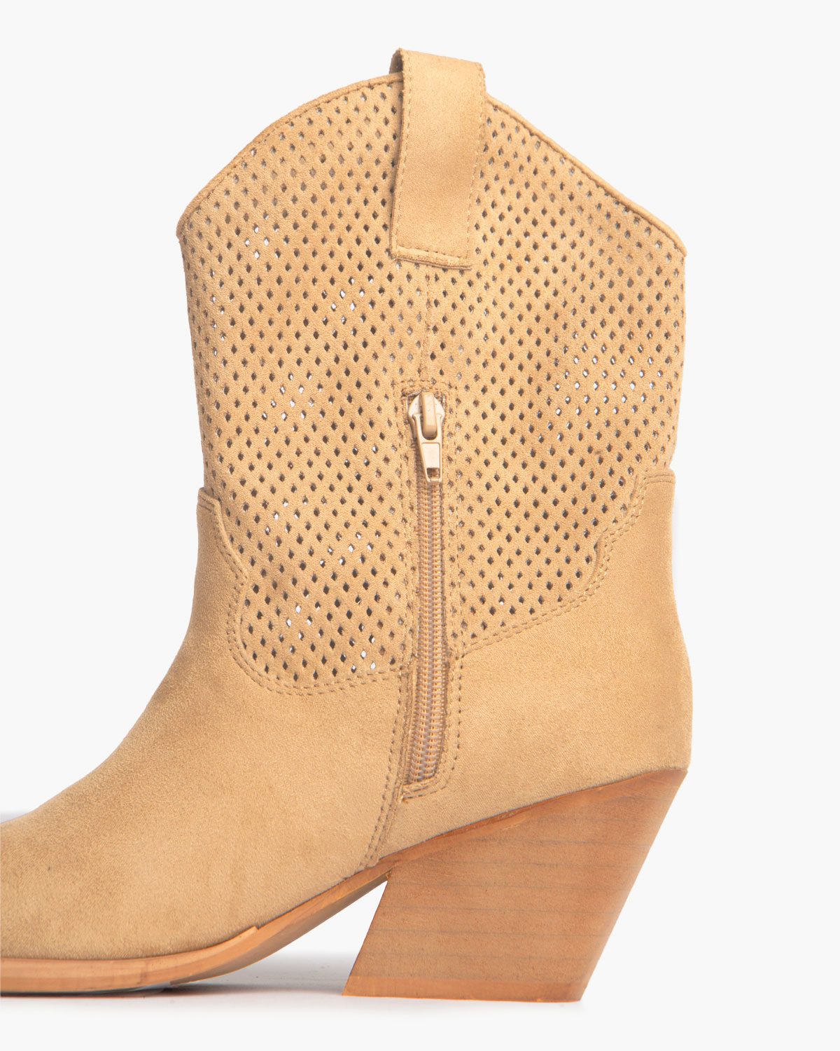 Botín estilo campero. Tiradores en los laterales y cremallera en la parte lateral interior. Detalle calado a láser en la caña.