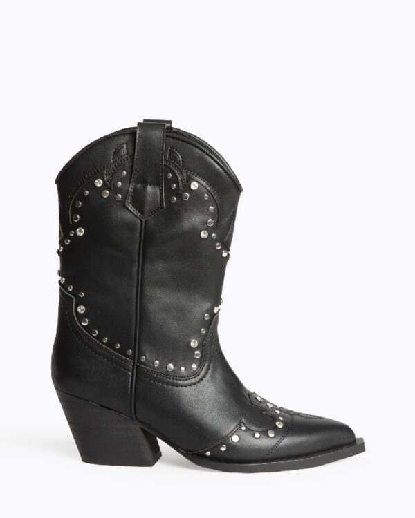 Botín de tacón medio, estilo cowboy. Cremallera en el lateral. Caña y puntera con detalles bordados y combinación de tachas y diamantes.