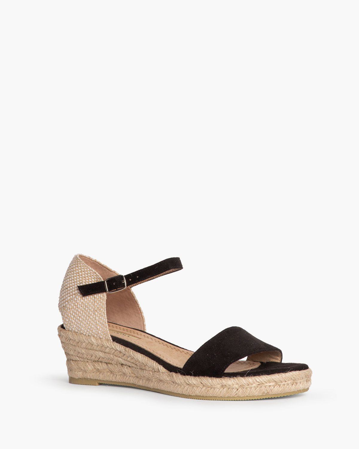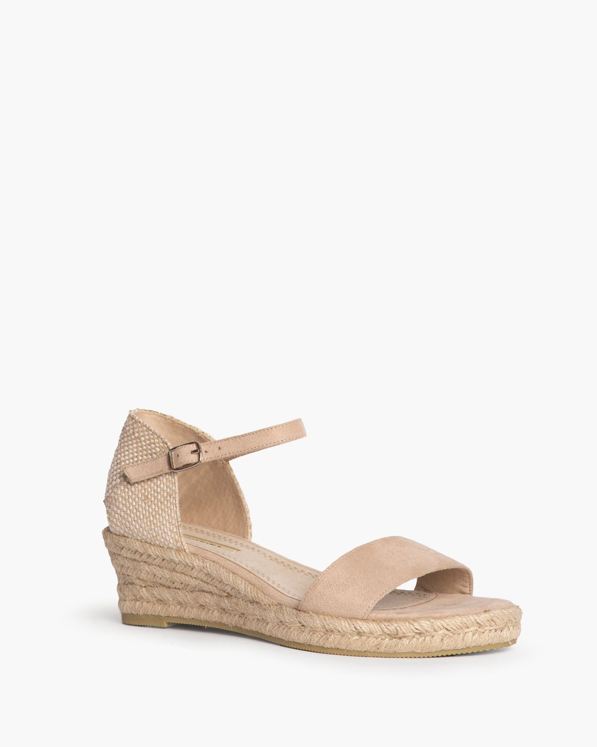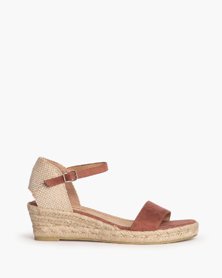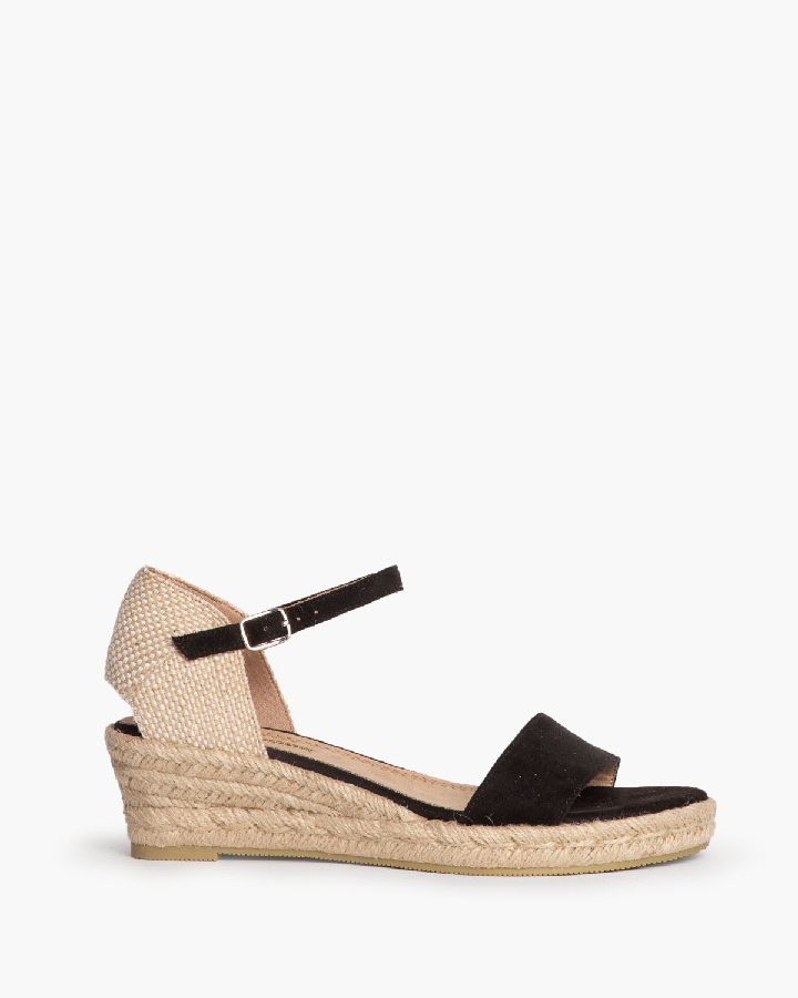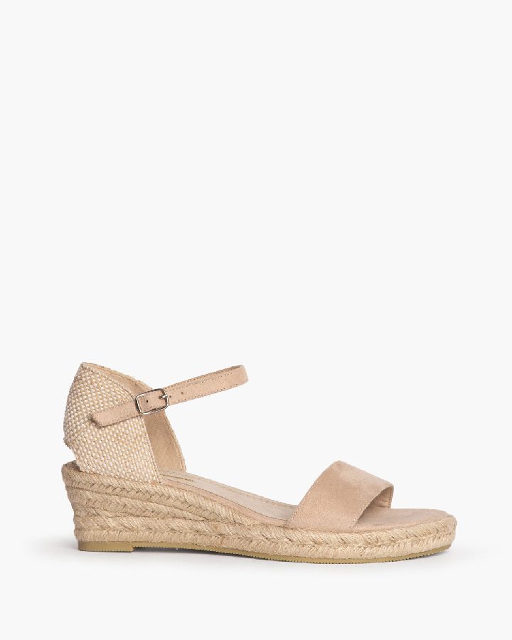 Sandalia de cuña bajo. Corte de pala ancha. Cierre mediante pulsera al tobillo con hebilla lateral en la parte exterior. Cuña de yute.