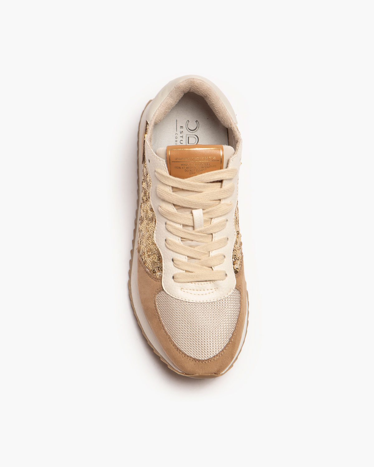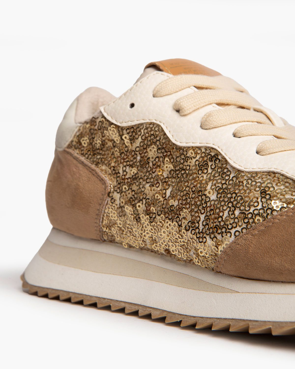 Zapatilla deportiva con corte en combinación de materiales, detalle de lentejuelas. Cierre mediante cordones de siete pasadas.