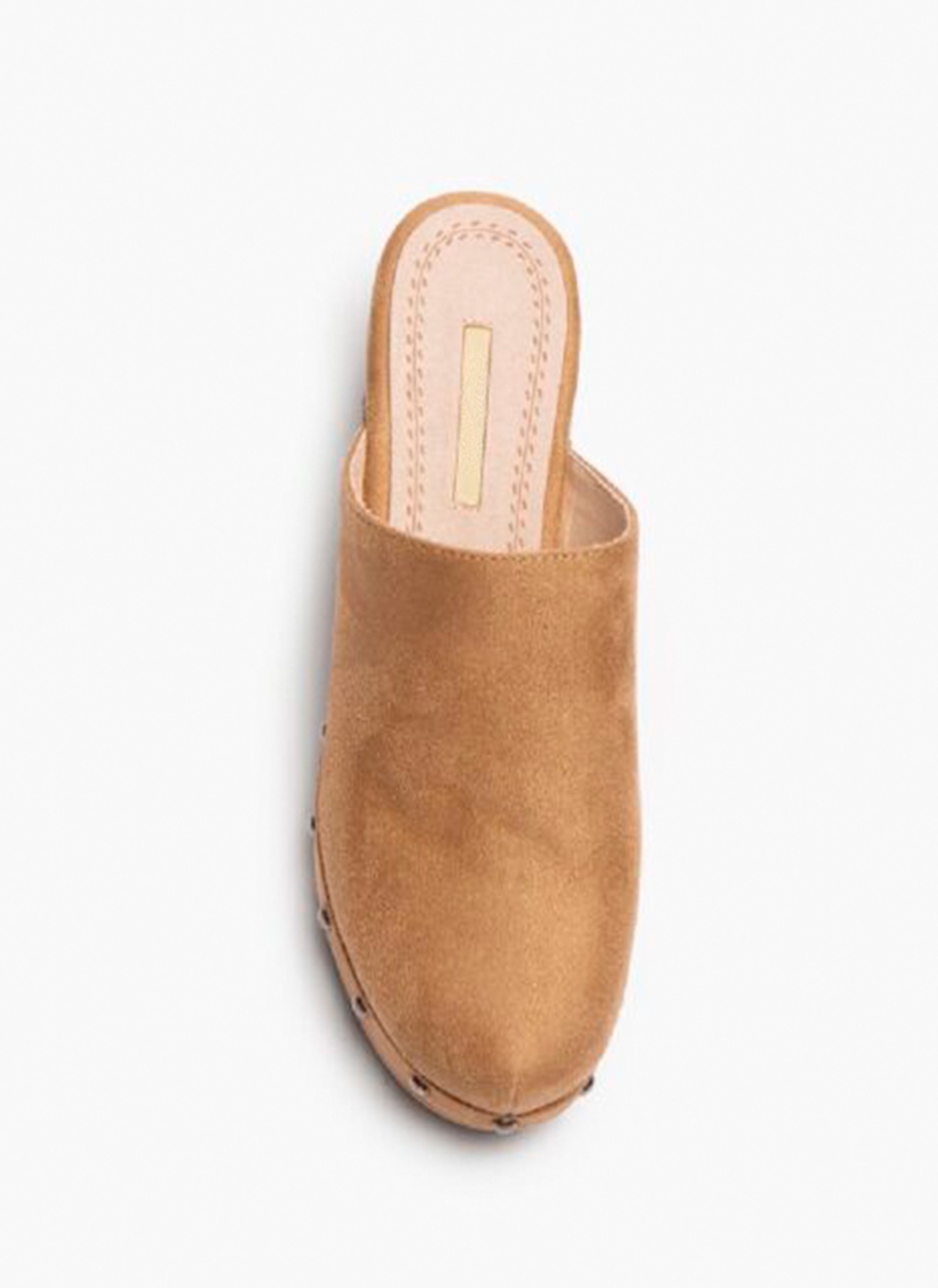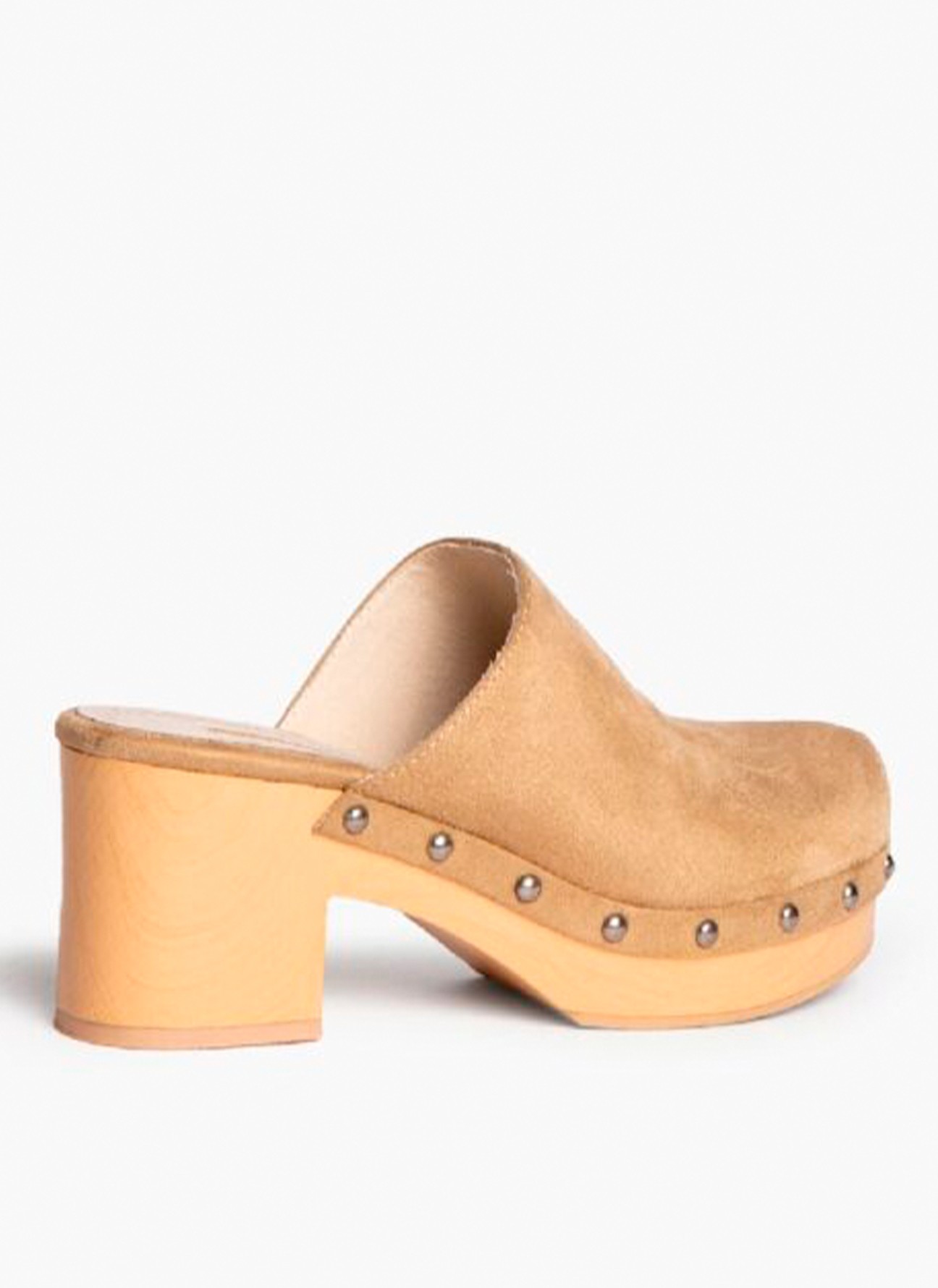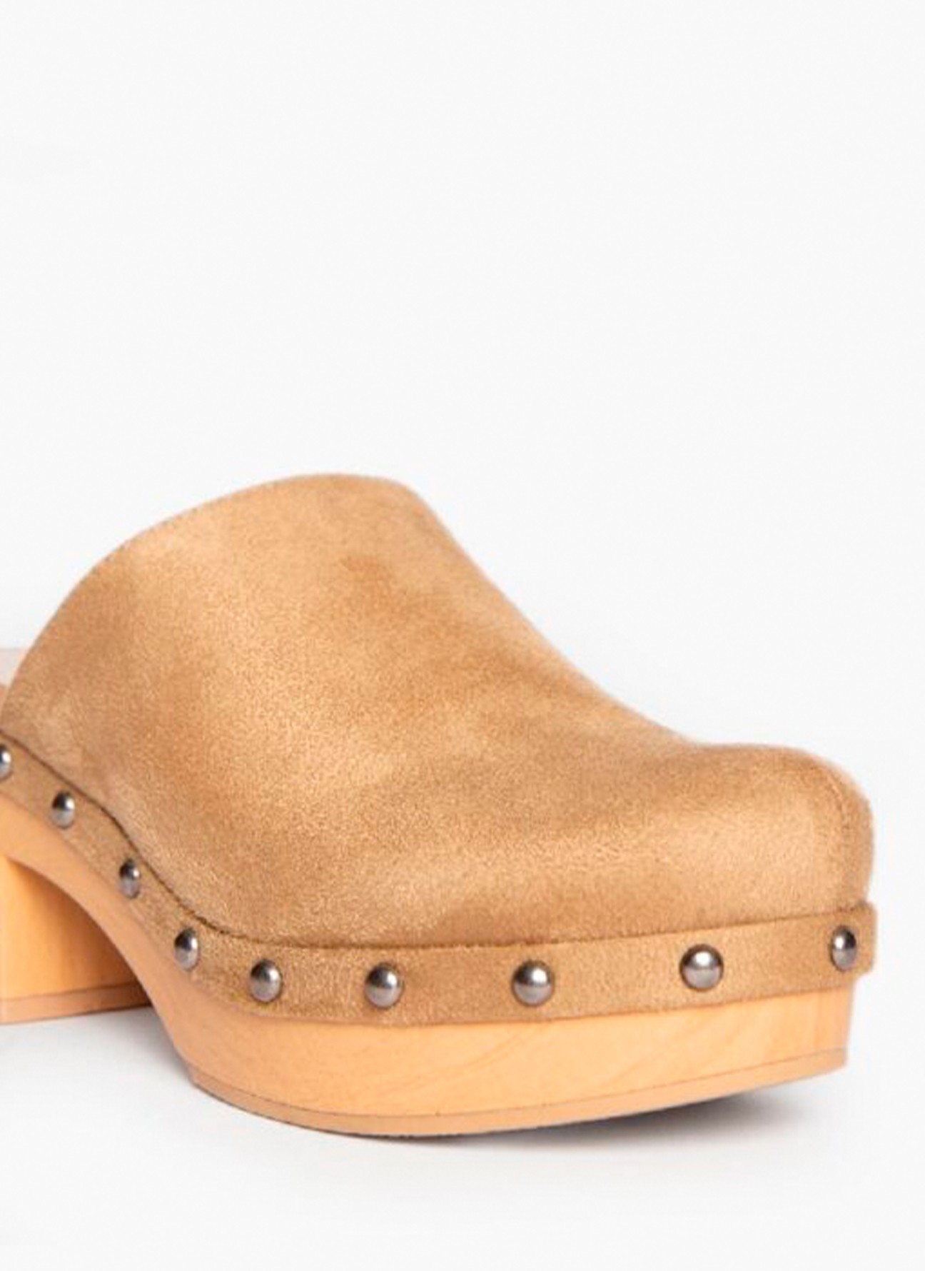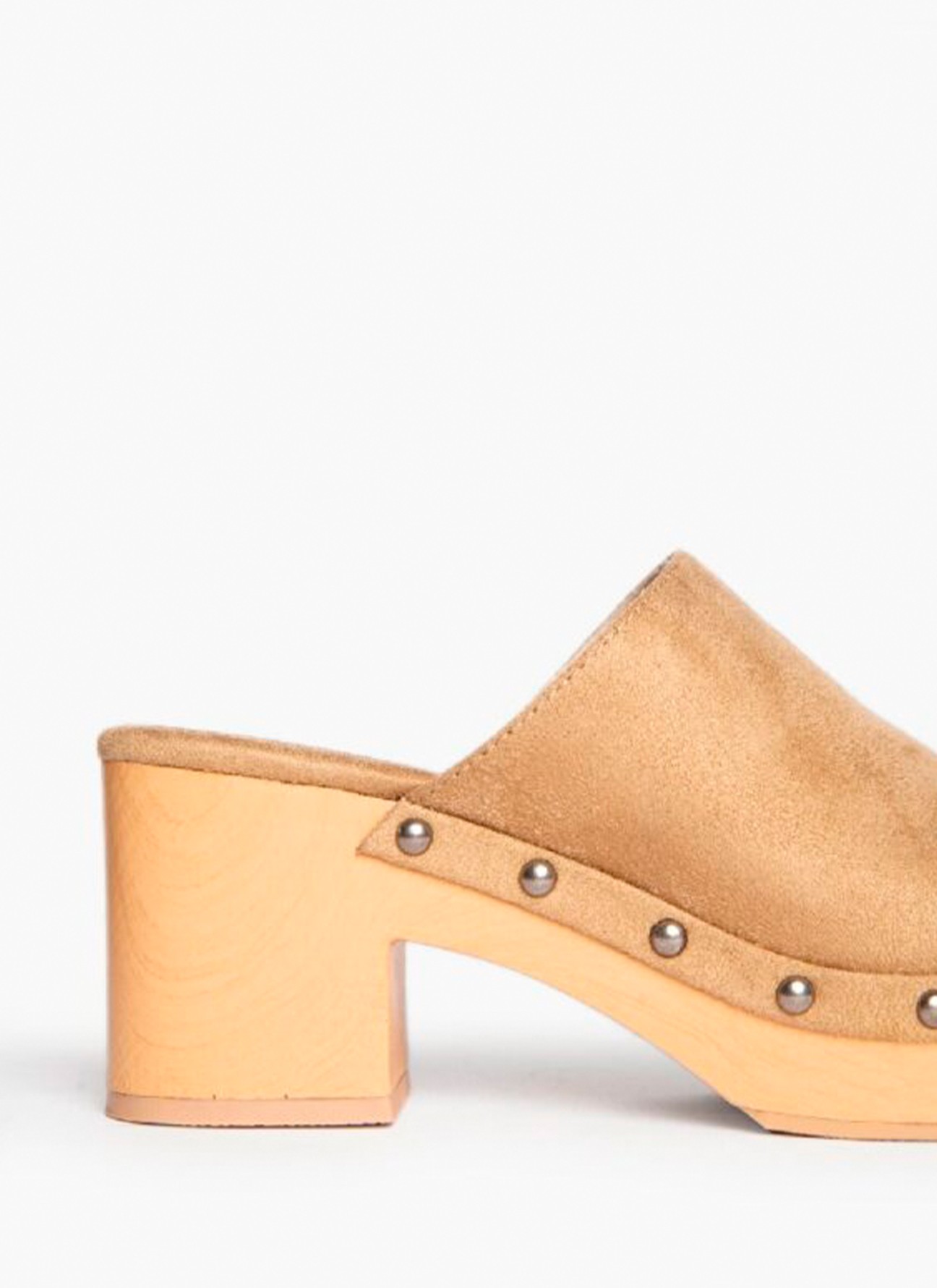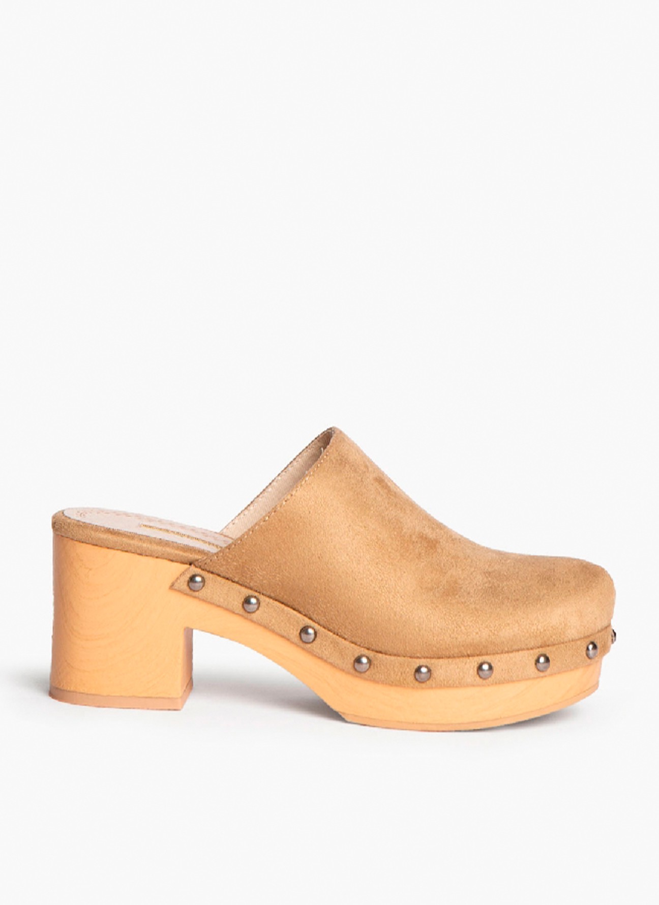 Zueco destalonado con piso efecto madera. Corte tipo antelina. Detalle de tachas entre el corte y el piso.